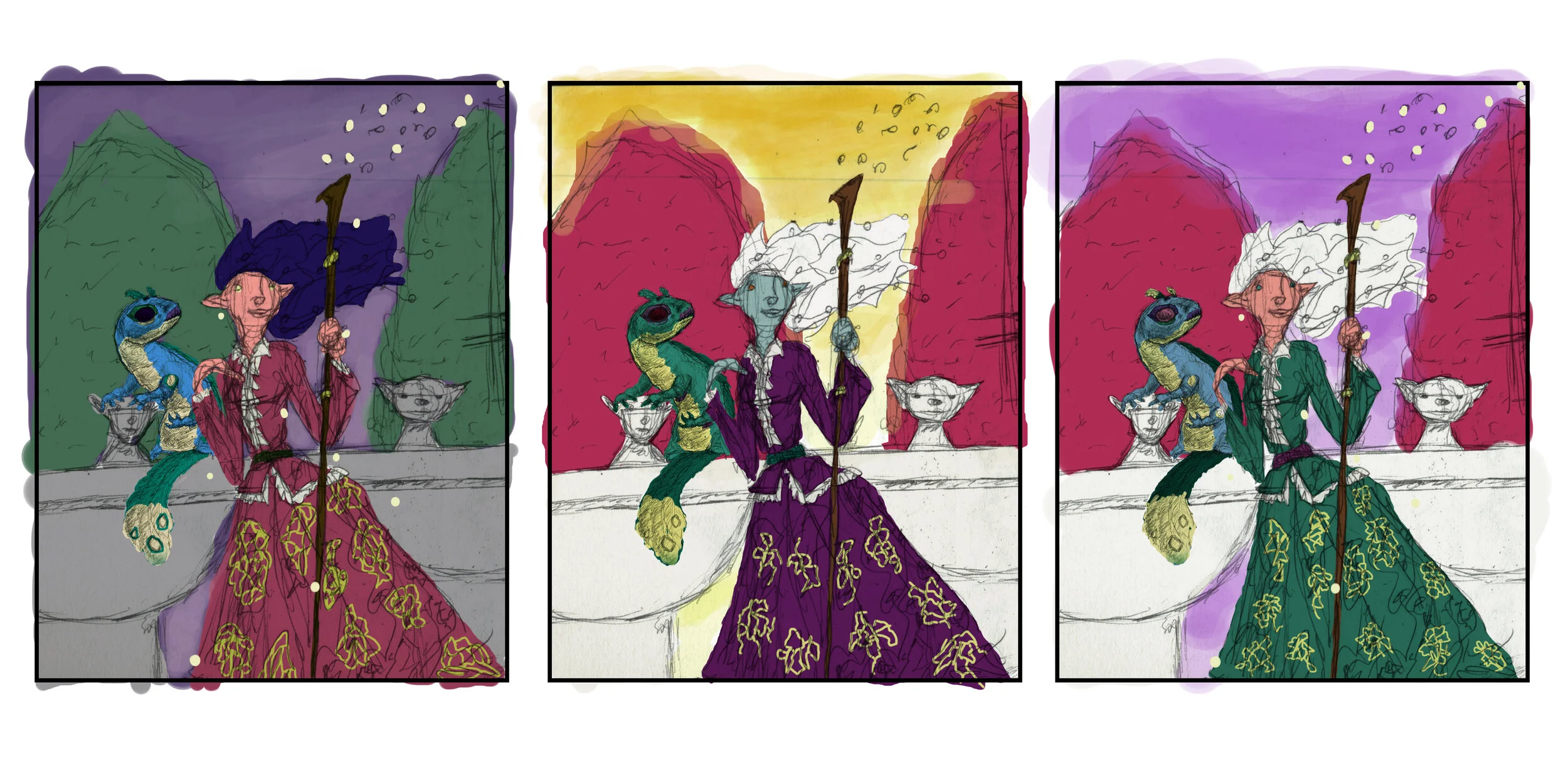 I wanted Manifest Lalora to have an elegant look to her and was in part inspired by Lady Galadriel from “The Lord of the Rings”. The poseable mixed-media art doll has a head made of Super Sculpey, her body is crafted from aluminum armature, plumber’s epoxy, and upholstery foam, aluminum tubing, paper tape, fabric, acrylic paint, and other materials. I came up with the composition and colors of the piece by doing sketches and a few color studies. I was really happy how the pink, green, red, and purples of “Manifest Garden” came together.